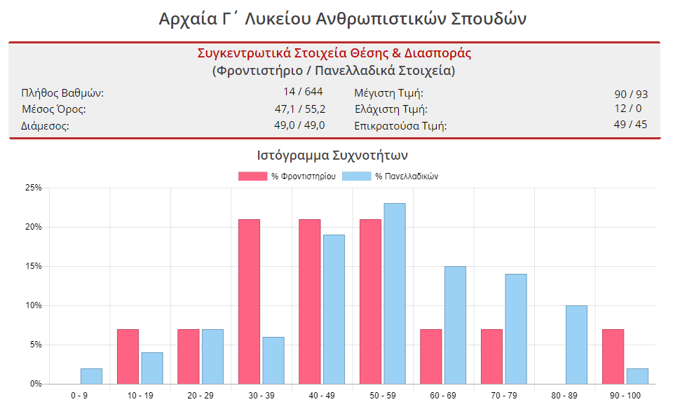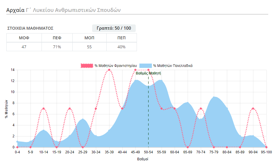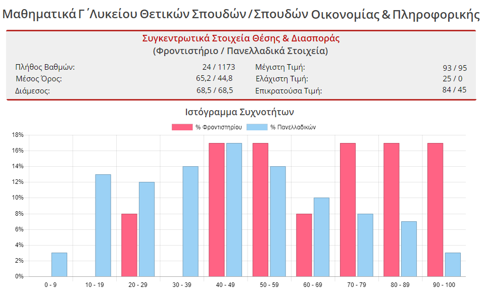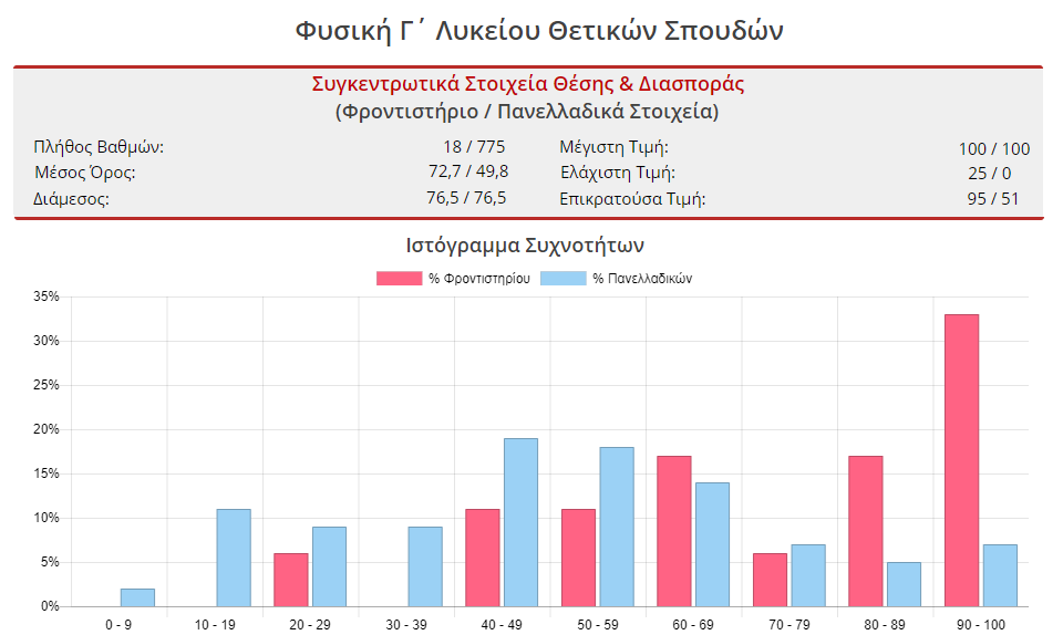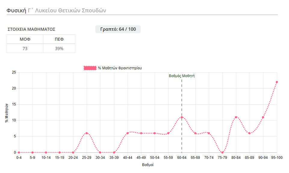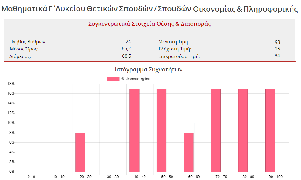 Το κάθε φροντιστήριο λαμβάνει τα στατιστικά των μαθητών του και τα πανελλαδικά στατιστικά, σε όσα μαθήματα έχει καταχωρίσει το βαθμό ενός τουλάχιστον μαθητή.