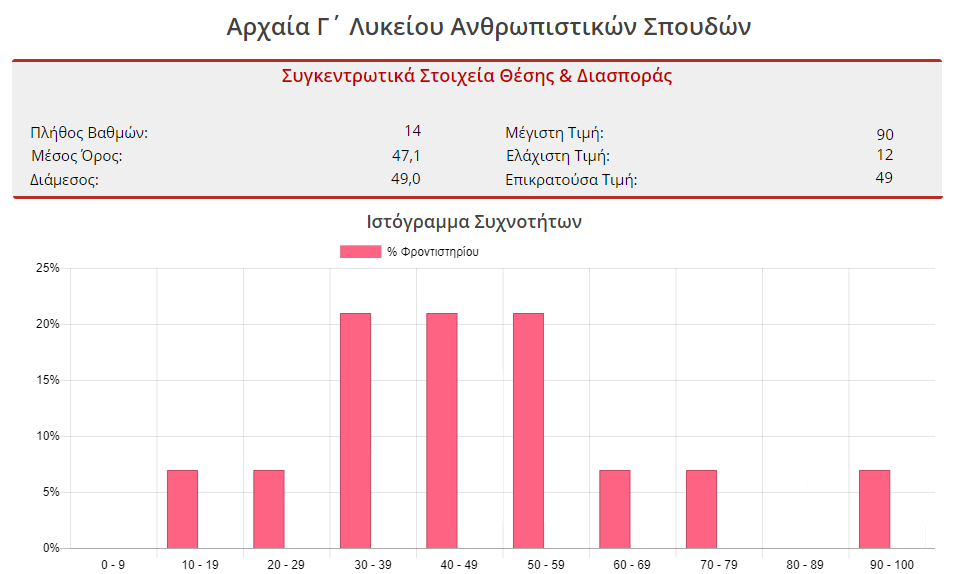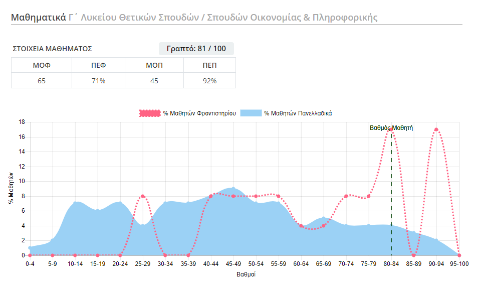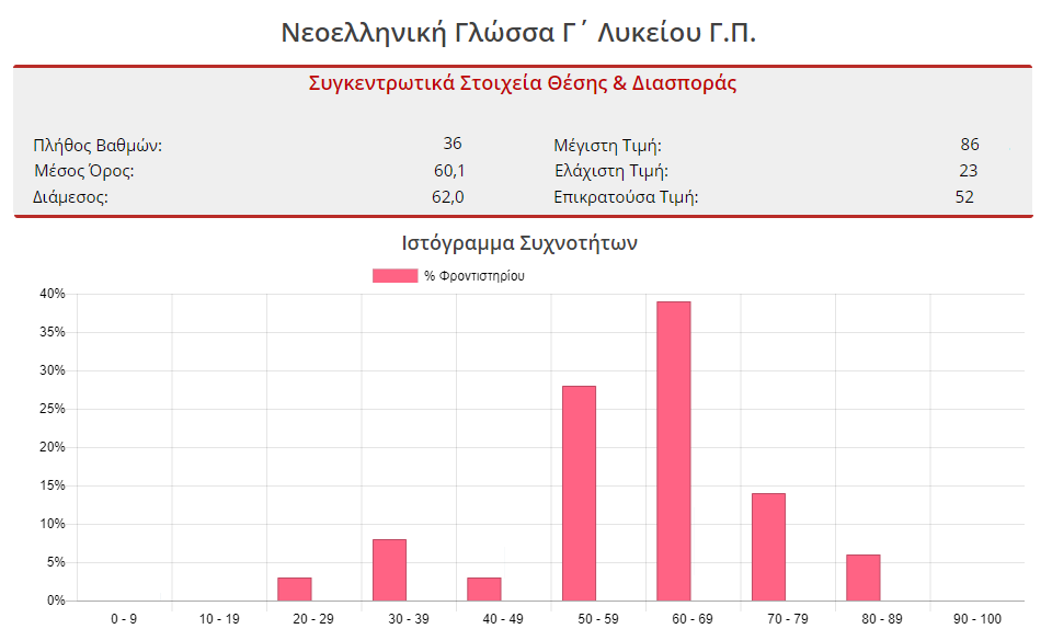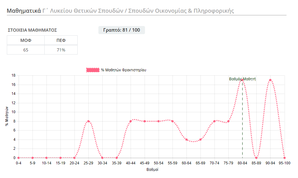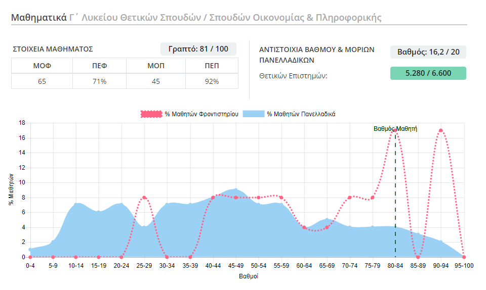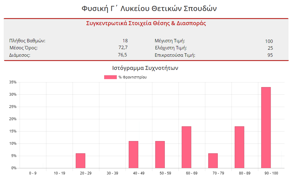 Το κάθε φροντιστήριο λαμβάνει τα στατιστικά των μαθητών του και τα πανελλαδικά στατιστικά, σε όσα μαθήματα έχει καταχωρίσει το βαθμό ενός τουλάχιστον μαθητή.