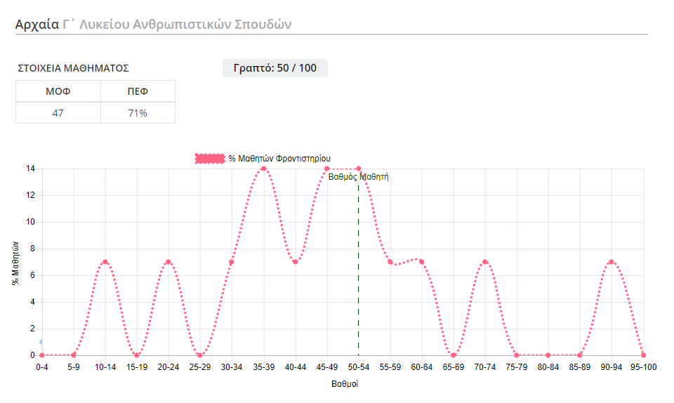 Επίσης, εάν το επιλέξει το φροντιστήριο, το Στατιστικό Προφίλ θα περιλαμβάνει την απόκλιση των βαθμών του μαθητή από: